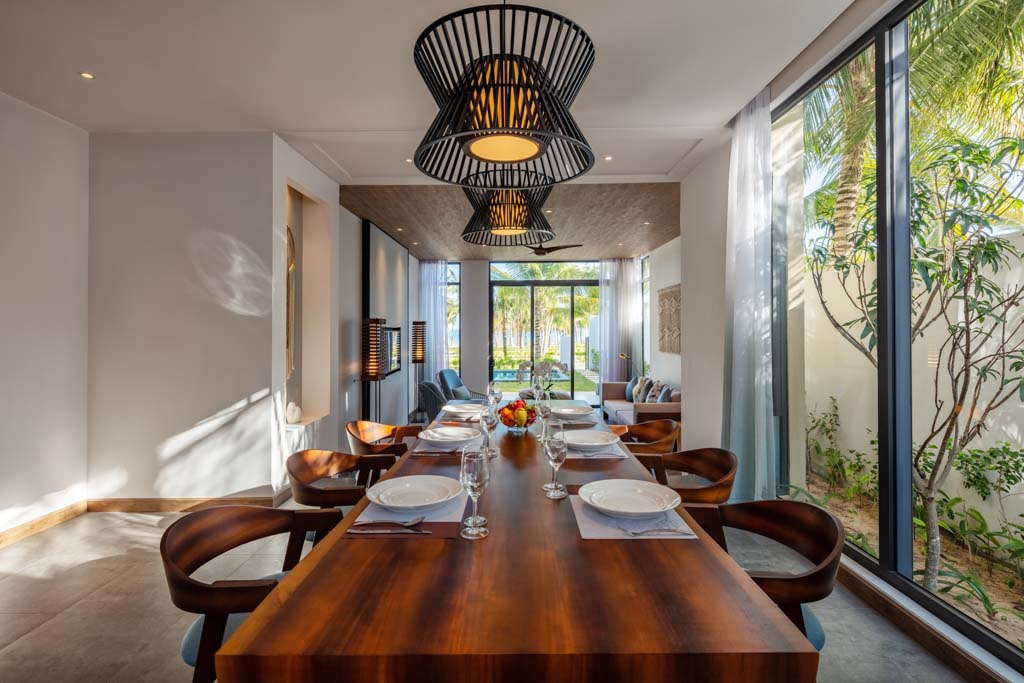 Những căn biệt thự mái lá thuần khiết được thiết kế 3 gian như nếp nhà truyền thống ngàn đời của người Việt, tạo khoảng không gian mở đón khí trời và ánh sáng tự nhiên. Những vật liệu thân thuộc như gỗ, tre, mây… được biến hóa một cách tinh tế thành nội thất thanh lịch mà đậm bản sắc.