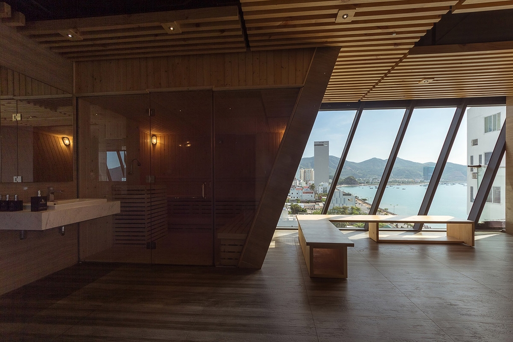 Hồ bơi vô cực trên tầng 7 của khu nghỉ, nơi bạn có thể ngắm mặt trời mọc và hoàng hôn trên biển.