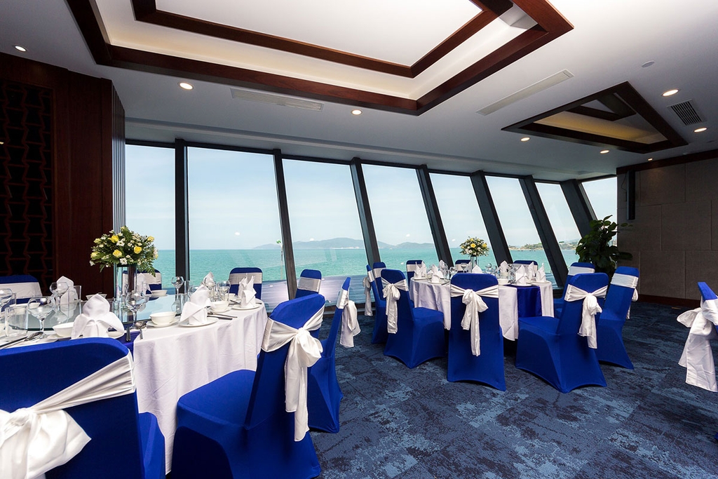 - Nhà hàng Club: nằm ở tầng 8 của khách sạn. Vừa thưởng thức đồ ăn, du khách vừa có thể ngắm nhìn hồ bơi vô cực và ngắm nhìn ra biển. Đặc biệt, nhà hàng này được xây dựng theo mô hình kết hợp câu lạc bộ game sẽ giúp du khách thư giãn, gắn kết trước và sau thời gian ăn. Thời gian mở cửa từ 10h – 22h - Nhà hàng Guangdong: chuyên phục vụ những món ăn ẩm thực Trung Hoa có tầm nhìn hướng ra biển. Nhà hàng được trang trí với gam màu đỏ đen và treo đèn lồng – kiểu trang trí truyền thống của những ẩm thực Trung Hoa. Thời gian mở cửa: từ 16h30 – 22h - Nhà hàng Sunflower: nằm ở tầng 5 của tòa nhà, có view hướng biển. Nhà hàng phục vụ du khách buffet sáng và bữa trưa bữa tối trong ngày. Bữa sáng là buffet, bữa trưa bữa tối theo phong cách A la Carte, ngoài ra các buổi tối cuối tuần có thể có tiệc hải sản tự chọn. Thời gian mở cửa: 6h30 – 22h - Blue Ocean Bar: nằm tại tầng 7 ngay hồ bơi của khu nghỉ. Thư giãn tại đây du khách sẽ bắt được khoảnh khắc mặt trời mọc tuyệt đẹp hay cảnh hoàng hôn buông xuống. Thời gian mở cửa: 8h – 21h.